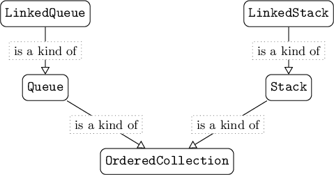 This lab includes an OrderedCollection abstract class which describes the commonalities between queues and stacks (also as discussed in lecture). Note that e.g. LinkedQueue is a subclass of both Queue and OrderedCollection, so it will need not only enqueue and dequeue methods but also insert and remove methods. The insert and remove methods can be implemented simply by calling enqueue and dequeue; we will rely on this commonality later to reduce the amount of code you need to write!