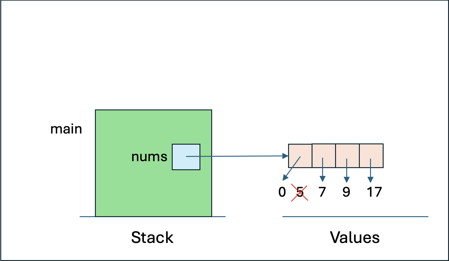 This is why nums[0] is now 0 instead of 5.