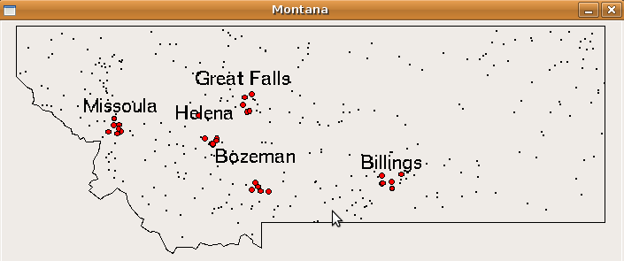 For example, below is the picture of Montana produced from this data (the boundary polygon comes from another source. If you are interested in this, contact Prof. Danner.) After plotting the points, wait for a mouse click to close the window.