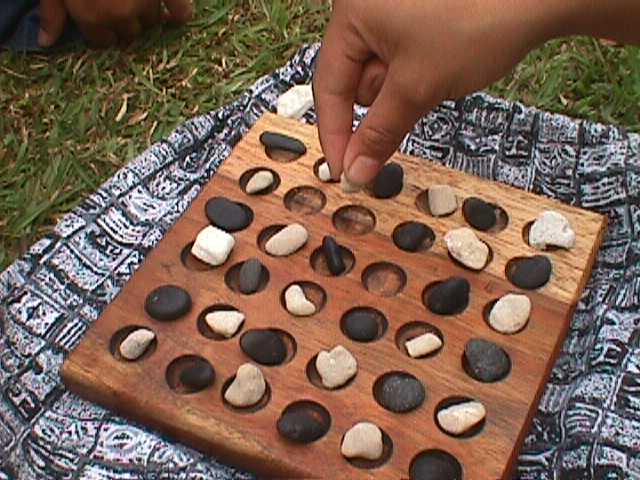 In order to play Konane, the black player goes first and removes one black piece from the corner or the center of the board. For an 8 by 8 board, this equates to positions (0,0), (3,3), (4,4), or (7,7). Next the white player removes a white piece adjacent to the space created by the first move. Then the players alternate moves, each jumping one of their own pieces over one horizontally or vertically adjacent opponent's piece, landing in an empty space on the other side, and removing the jumped piece. If desired, this may be continued in a multiple jump, as long as the same piece is moved in a straight line. The game ends when one player can no longer move and that player is considered the loser.