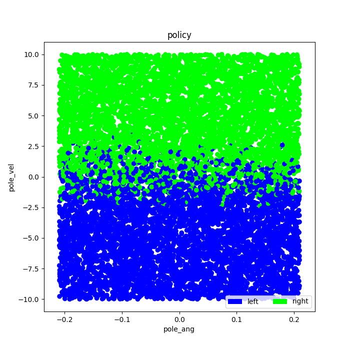 Prior to training, the neural network will be initialized with small random weights, so the Q-learner will start with some random policy. The scatter plot above left shows one such random starting policy. The scatter plot above right shows how the policy changed as a result of training. In these scatter plots the color of a point represents the action that would be taken for a particular pole angle and velocity. Blue indicates a left action and green indicates a right action.