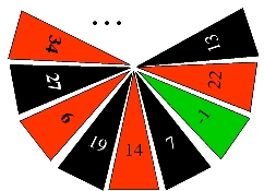 Roulette is a betting game that is played with a roulette wheel and a ball. The roulette wheel consists of 38 sectors, each with a number and a color. The wheel spins with the ball in it, and the ball eventually comes to rest in one of the sectors. Players who placed a bet on a number or color that matched the one on which the ball stops, win their bet. Here is a picture of a Roulette wheel: