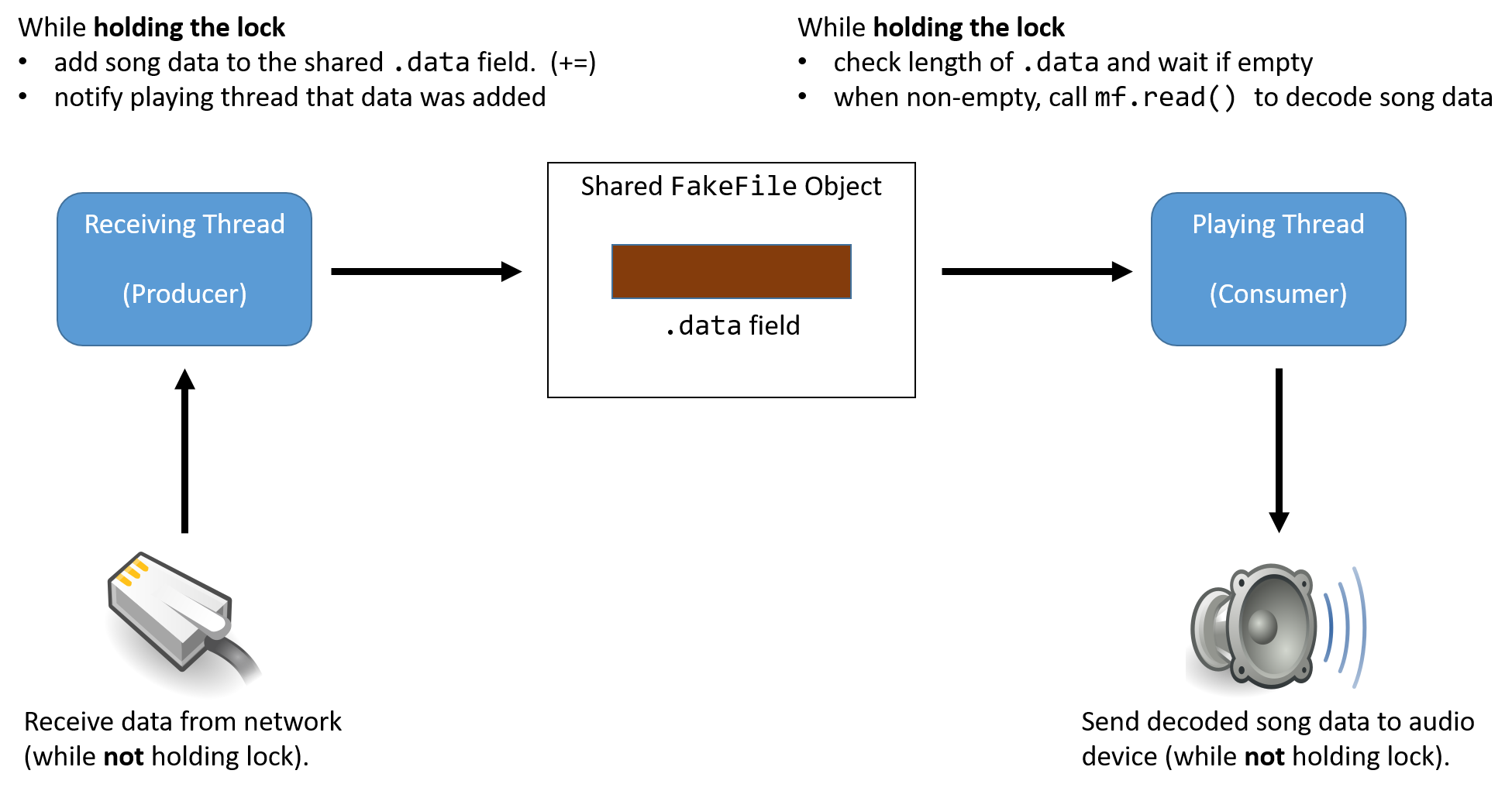 The receiving thread and playing thread have a producer/consumer relationship. As the receiving thread receives song data, it produces data by appending it to the outstanding data that needs to be played. The playing thread consumes the data by working through from start to end. This relationship means you need to guard against two potential problems using thread synchronization: