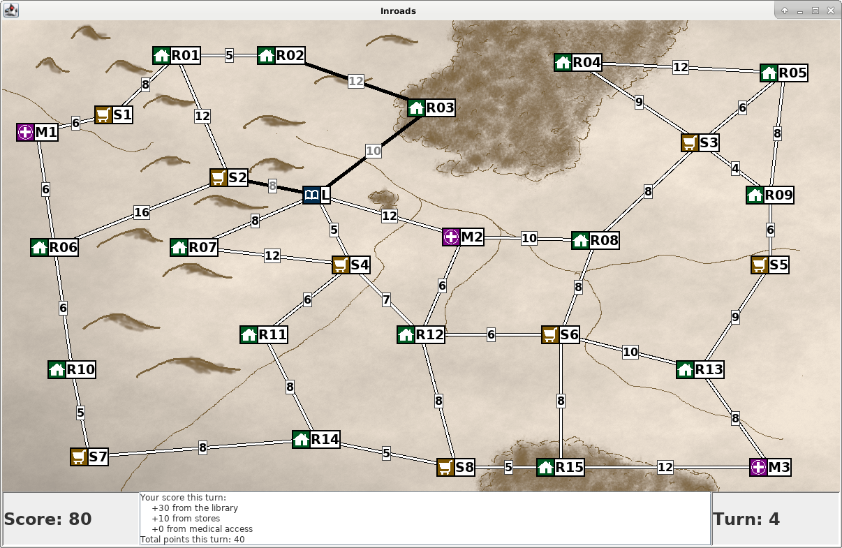 We might choose to connect the residential location R03 to the library L toward the center of the map. At the end of this turn, R03 is connected to the library and so scores 15 points. Note that the message box at the bottom of the GUI gives a summary of the points earned from the last turn.